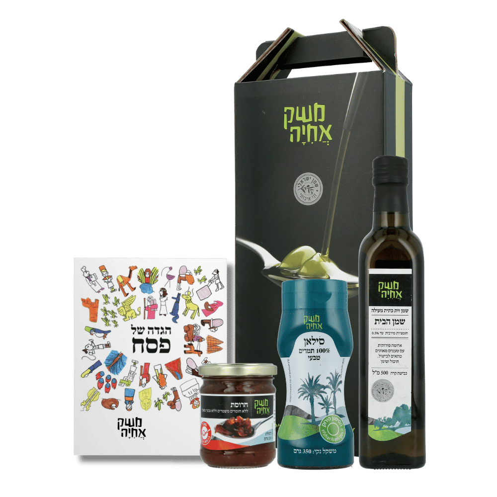 הוסיפו אור וערך חברתי לשולחן החג עם מארז אסיף המיוחד לפסח. המארז משלב בין טעמים ישראליים שורשיים – שמן זית ‘שמן הבית’ כתית מעולה, סילאן טבעי וממרח חרוסת מסורתי – לבין “הגדה של פסח” בהוצאת עמותת שק”ל. זוהי הבחירה המושלמת למי שמחפש מתנה כשרה לפסח המשלבת איכות קולינרית בלתי מתפשרת עם תרומה לקהילה ועשייה חברתית מרגשת.
