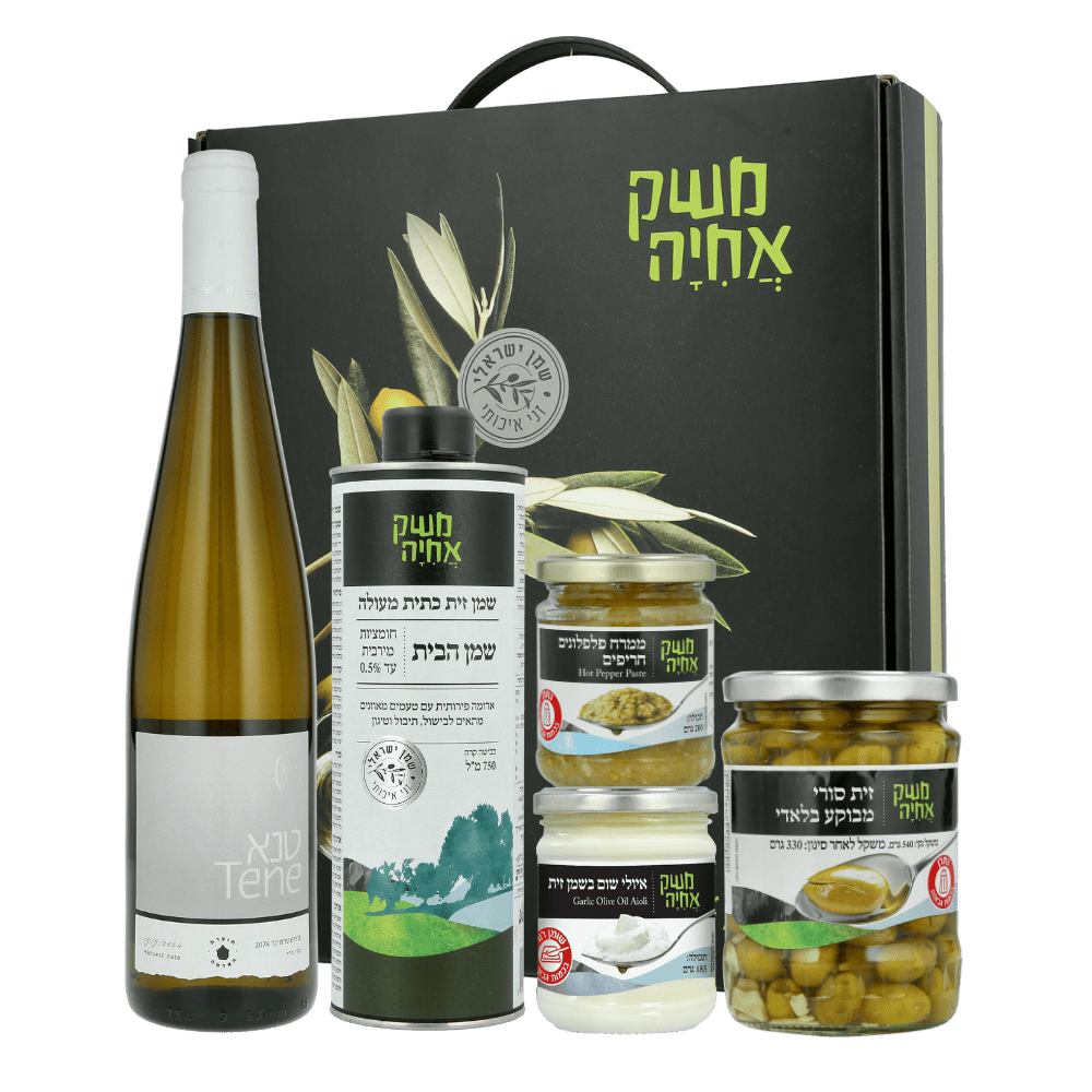 מארז קופסא מהודר המכיל יין מסדרת “טנא” גוורצטרמינר 750 מ”ל, ממרח פלפלונים חריפים 200 גרם , ממרח איולי שום 185 גרם, פח שמן זית 750 מ”ל וצנצנת זיתים סורי 540 גר’ (לאחר סינון: 330 גר’)